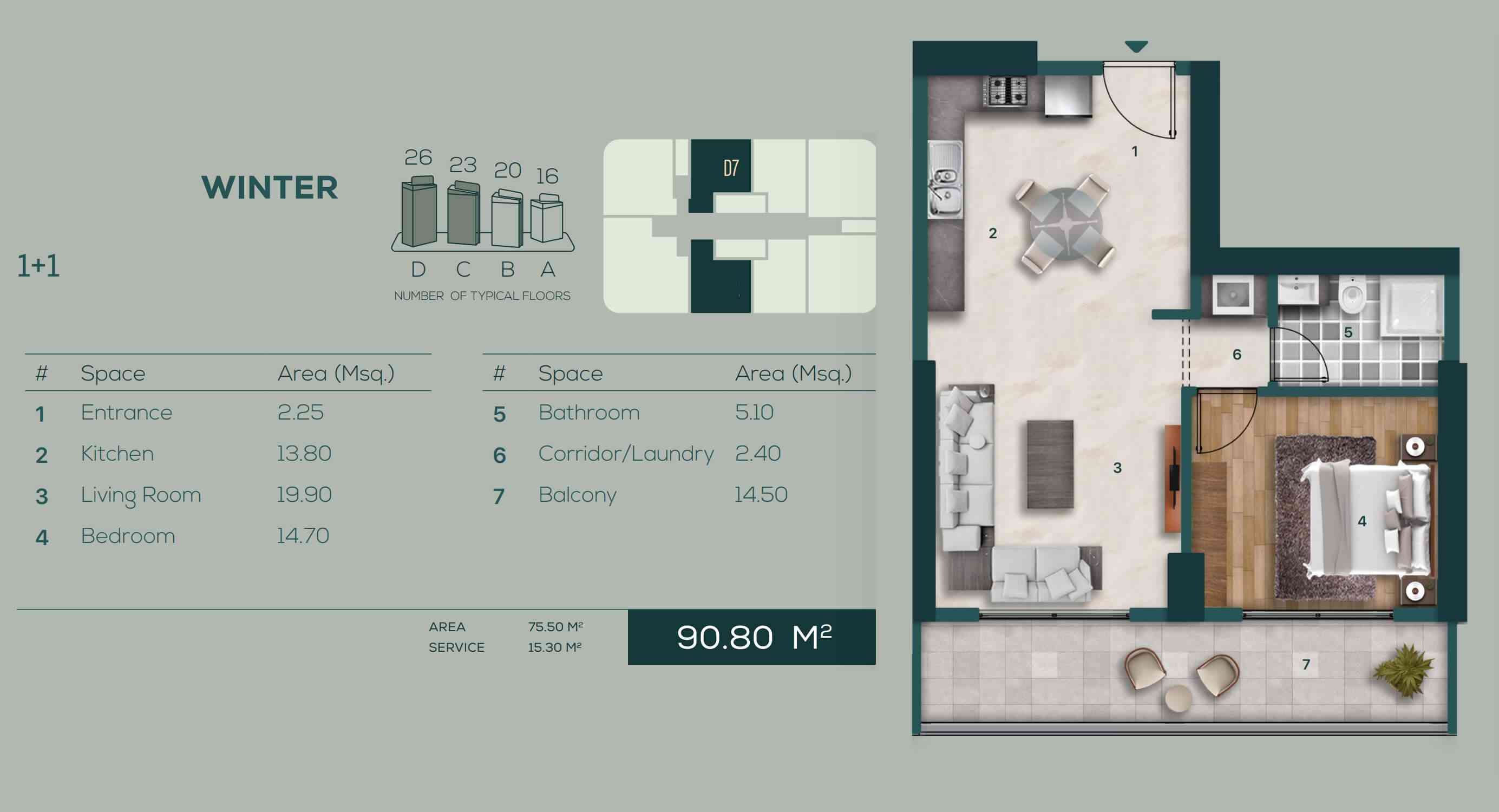 Tower D Winter1+1Area: 90.80 M2
